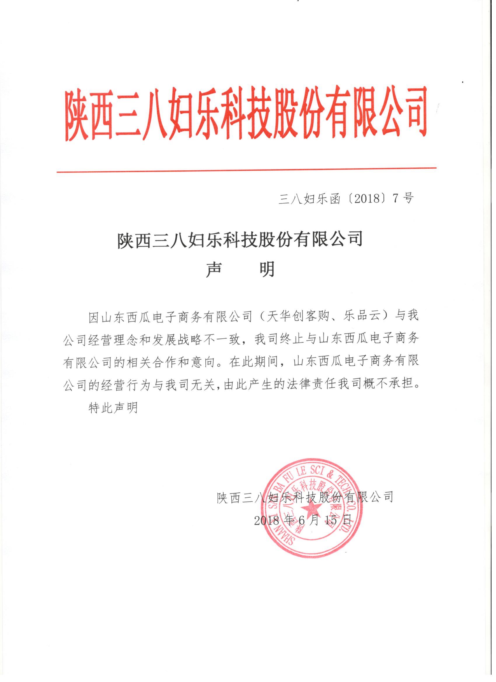 陕西三八妇乐科技股份有限公司郑重声明