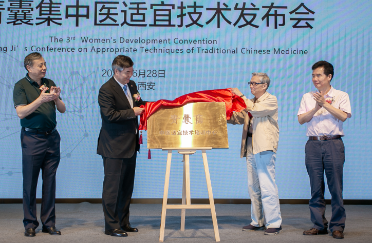 随后,政协陕西省九届委员会副主席陆栋,陕西省政协医药卫生体育委员会副主任刘昌军,中国针灸学会副会长、陕西省针灸学会会长、陕西中医药大学原副校长刘智斌教授,与三八妇乐集团董事长袁晓峰共同为青囊集中医适宜技术培训中心揭牌。